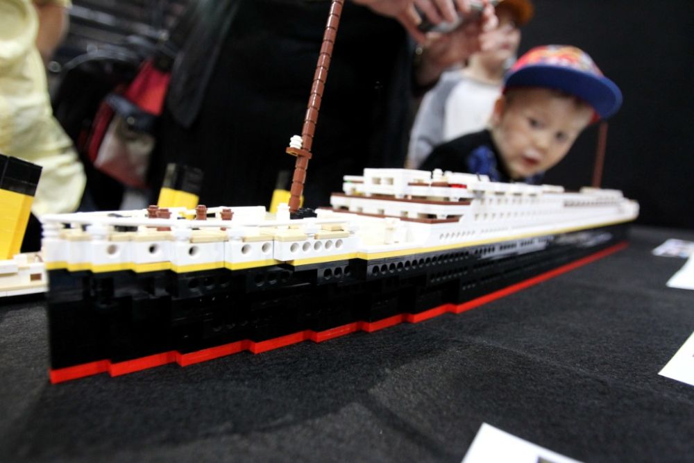 2014年10月11日,在芬兰首都赫尔辛基附近的万塔市能源球馆,一名儿童欣赏乐高积木搭成的“泰坦尼克”号。新华社记者李骥志摄