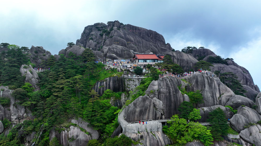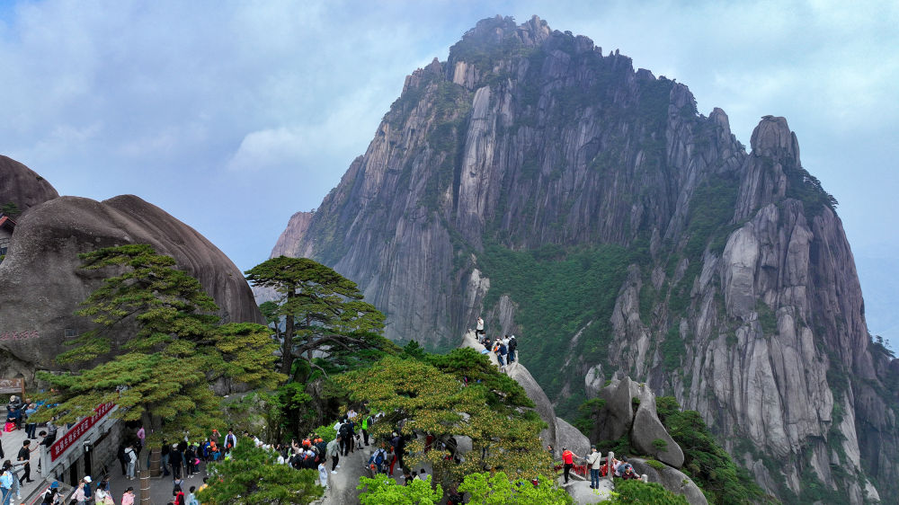 ↑5月18日,游客在安徽黄山风景区玉屏景区游览(无人机照片)。黄山位于安徽省南部黄山市境内,群峰竞秀,怪石林立,以奇松、怪石、云海、温泉、冬雪“五绝”著称。明代大旅行家徐霞客曾两次登临黄山,赞叹道:“薄海内外无如徽之黄山,登黄山天下无山,观止矣!”新华社发(樊成柱 摄)