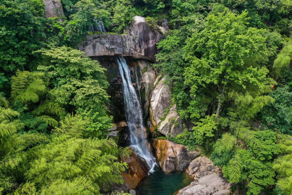 ↑5月16日在浙江省台州市天台县天台山风景旅游区拍摄的石梁飞瀑一景(无人机照片)。石梁飞瀑景点有一条巨大石梁横跨在两崖之间,瀑布水流从梁底穿过,坠入幽谷之中。徐霞客在游记中写道:“下瞰深潭,毛骨俱悚。”新华社记者 徐昱 摄