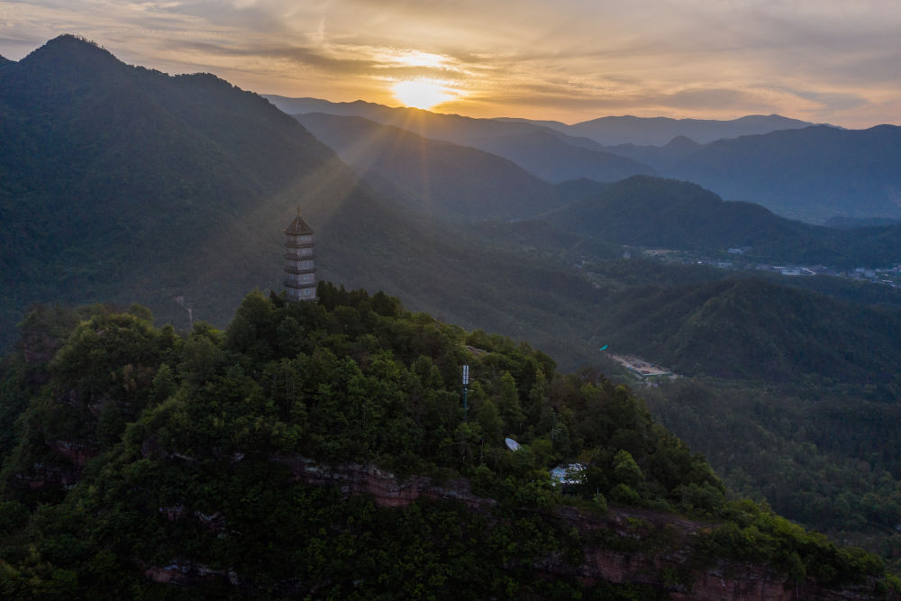 ↑5月16日,在浙江省台州市天台县,清晨的阳光照在赤城山顶的梁妃塔上(无人机照片)。新华社记者 徐昱 摄