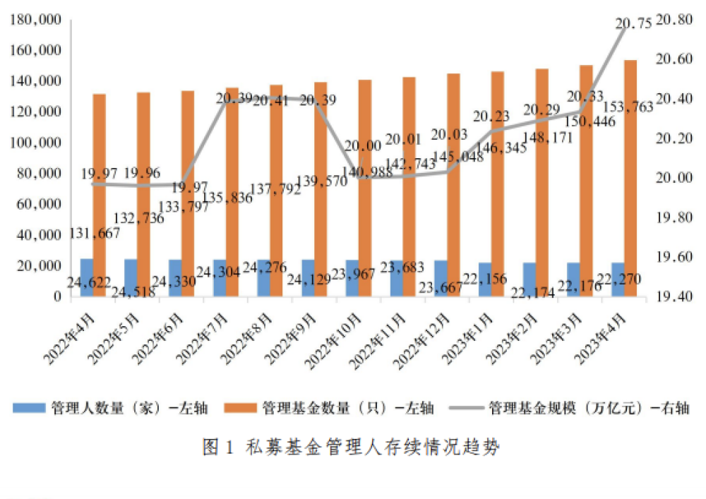 中国证券投资基金业协会日前发布的数据显示,截至2023年4月末,存续私募基金管理人22270家,管理基金数量超15.37万只,管理基金规模20.75万亿元。该规模较上月增加4167.28亿元,环比增长2.05%。