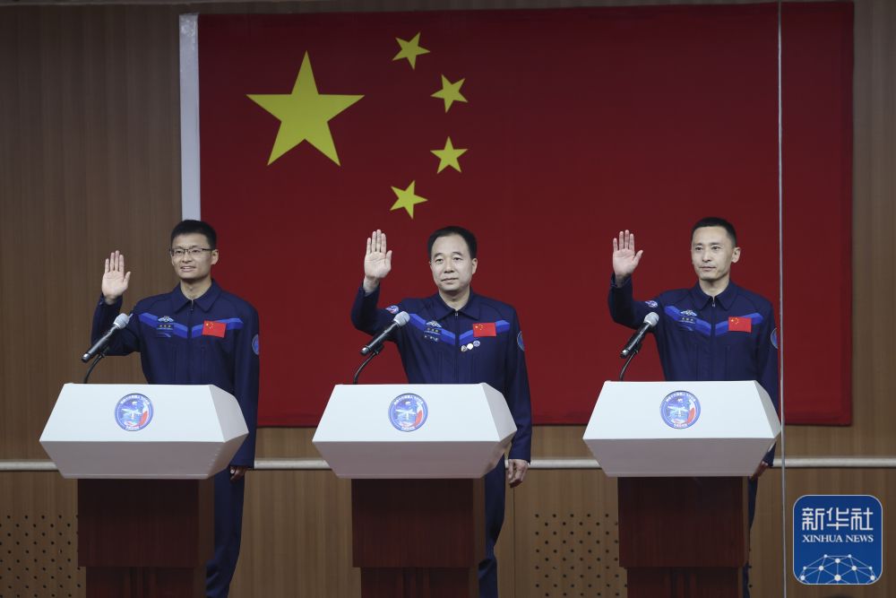 5月29日,神舟十六号航天员乘组与中外媒体记者集体见面会在酒泉卫星发射中心问天阁举行。这是指令长景海鹏(中)、航天飞行工程师朱杨柱(右)、载荷专家桂海潮挥手致意。新华社记者 金立旺 摄