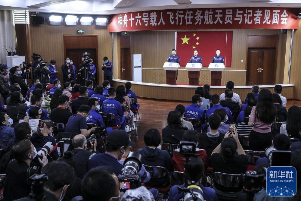 这是指令长景海鹏(中)、航天飞行工程师朱杨柱(右)、载荷专家桂海潮回答记者提问。新华社记者 金立旺 摄