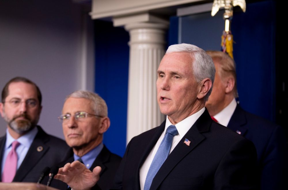 2020年2月29日,在美国华盛顿,时任美国副总统彭斯参加白宫记者会。新华社记者刘杰摄
