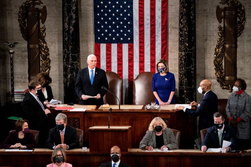 2021年1月6日,在美国华盛顿国会大厦,时任美国副总统彭斯(后排中左)和时任国会众议院议长佩洛西(后排中右)出席国会联席会议。新华社发(Pool图片,埃林·沙夫摄)