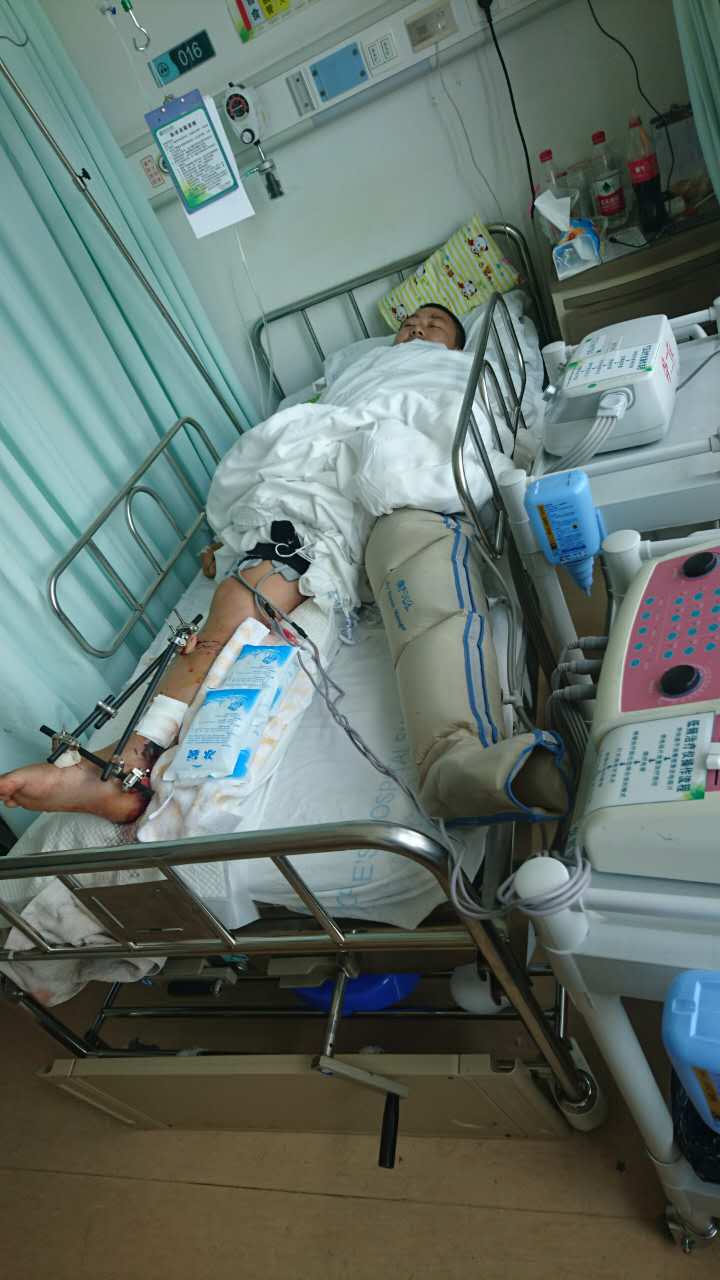 当时附近的两家医院都不敢收,他最后被送往市人民医院抢救。医生经过检查发现,他全身多处骨折,尤其是右胫腓骨中下段开放性粉碎性骨折,右踝关节也严重骨折,右小腿神经、血管损伤等。