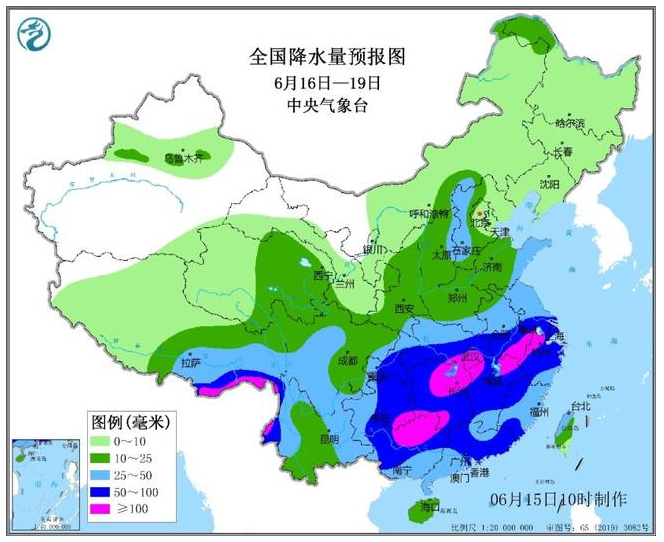 强降雨雨量预报:16日至19日,华南、江南、江汉、江淮以及西南地区东部等地的部分地区有大到暴雨,局地大暴雨,并伴有短时强降水、雷暴大风等强对流天气;上述地区累计降雨量40~80毫米,其中湖北东南部、湖南北部、江西北部、安徽南部、浙江西北部以及广西北部等地累计降雨量有100~200毫米,最大小时降雨量40~70毫米,局地可达80毫米以上。
