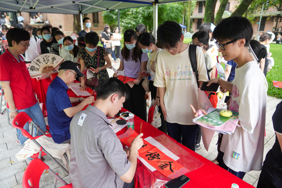 书画协会为考生题写“金榜题名”的祝福语校园文化集市是中大一张靓丽的名片。在黑石屋前,书画协会的才子为考生家长题写“金榜题名”的祝福语,送上一份最真挚的中大祝福。中大出版社、文创店、生物博物馆与话剧社、书画社等多个社团也齐聚马丁堂前,共同展示精美的文创产品,呈现多姿多彩的社团风貌。“中山手创”“中大印象”等系列精彩纷呈,将古韵优雅的中大风光定格成一帧帧剪影,将追求卓越的中大精神凝结成一幅幅图鉴。在这里,创意燃动智慧,匠心铸就精品,中大文化内核以具象化的形式完美呈现。许多考生家长于此驻足,在打卡展台的同时选购心仪的文创产品,欣赏多样化的社团文化,感受青春中大的魅力。