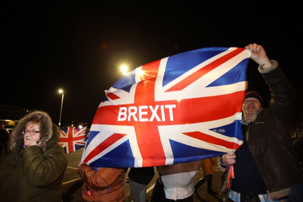 2020年1月31日晚,在英国北爱尔兰贝尔法斯特,支持“脱欧”的人们参加庆祝集会。新华社发(保罗·麦克兰摄)
