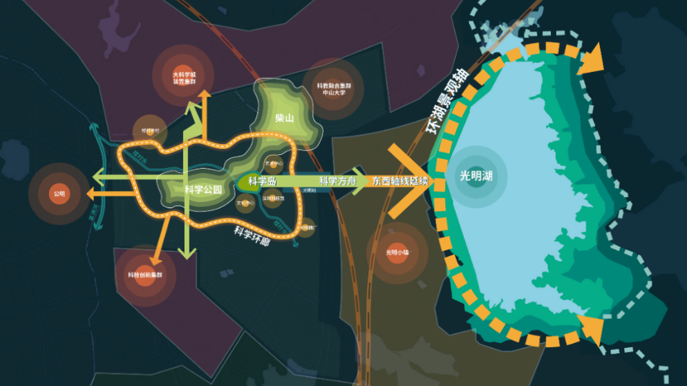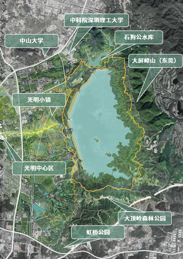 光明湖碧道是深圳市“五河两湖”骨干碧道,是 “山海连城计划”中“山脊翠”的重要节点。光明湖碧道作为光明科学城蓝绿会客厅,未来将串联起科学城智慧公园、欢乐田园、迳口古村、虹桥公园、大顶岭绿道、大屏障森林公园等环湖景观资源,促进山海连城计划,并以光明湖为核心辐射周边区域,促进片区资源交互,带动片区活力。