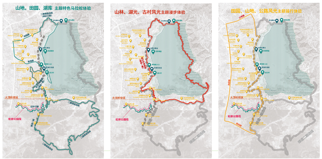 光明湖碧道南接大顶岭绿道,途经迳口村、欢乐田园、天安云谷,北侧至石狗公水库,接光明森林公园郊野径,形成25km环湖慢行道。光明湖碧道联动,形成光明科学城的共享慢行系统,形成特色的“运动三环”:42km的山湖马拉松道、25km的山林漫游道、20km的自行车赛道。