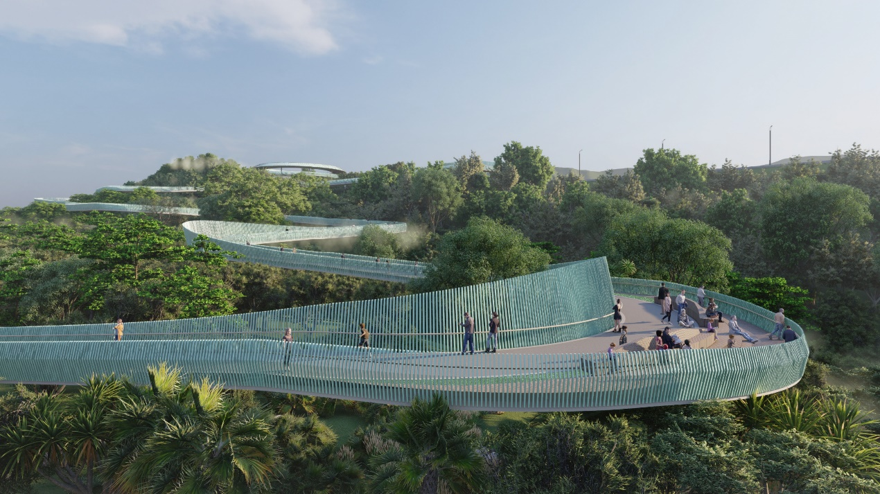 观湖云桥采用中国传统色彩“天青”,以山水画中的行云为灵感,营造“山涧之云绕、半山之云台、山顶之云环”的游览序列,为市民提供“坐看云起时”的观景体验。