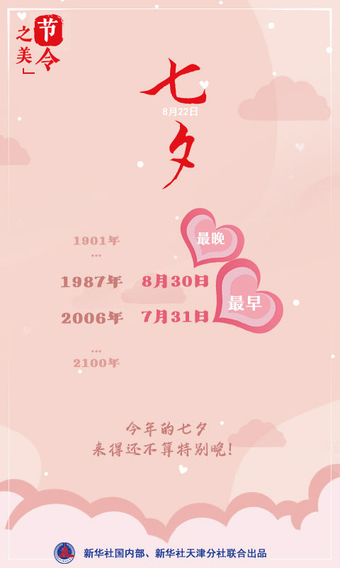 今年的七夕是来得最晚的吗?不是!1901年至2100年这200年的统计结果显示,七夕对应的公历日期最早可落在7月31日(如2006年),最晚可落在8月30日(如1987年),这也意味着,公历7月31日至8月30日中的任何一天都有可能成为七夕。照此来看,今年的七夕来得还不算特别晚。
