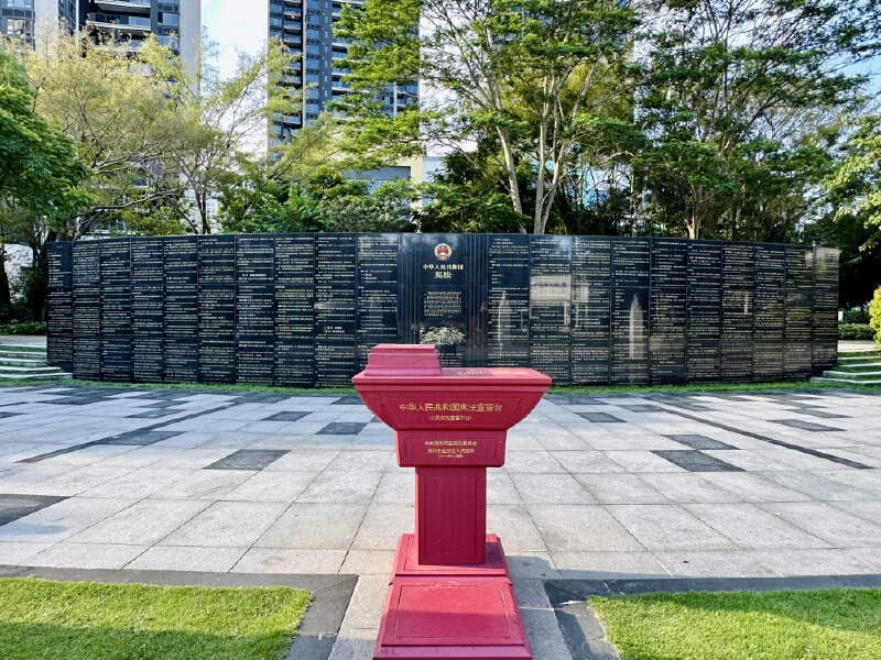 深圳宪法公园位于沙头角海滩路,是在东和法治文化主题公园的基础上建设而成。初入其中,会以为它只是一个普通的社区公园。走到中心位置,便看到全国最大的景观园林宪法墙。主题雕塑宪法墙总长21米,高3.4米,以厚重的黑色大理石为底板,将宪法条文雕刻其上。站在宪法墙前,让人不由得肃然起敬。