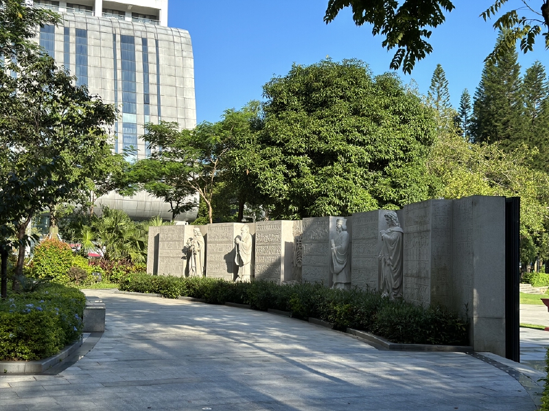 行至“古今说法”凉亭,修长的法治长廊映入眼帘,两侧石柱上嵌装着古今中外说法、名人名言等内容。这道长廊不仅是闲暇休憩的好去处,也是能够随时感受崇法尚法氛围的文化景观。