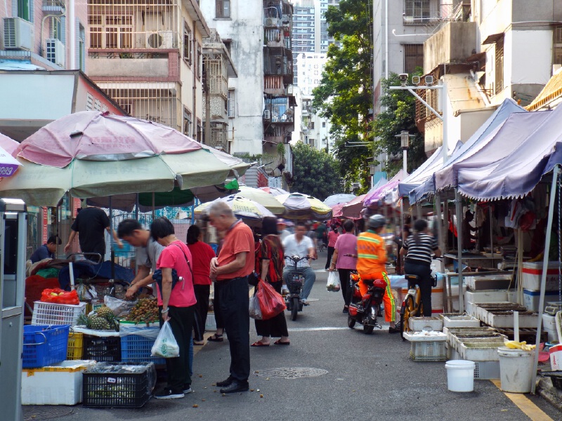 街市,是都市的烟火聚集地,金融路街市可能就是大多数沙头角人最有记忆的老地方。不长的街道上整齐的一位一摊,摊主们操着各自的家乡话卖力地售卖水果、海鲜、蔬菜……一日三餐,这里“配备齐全”。