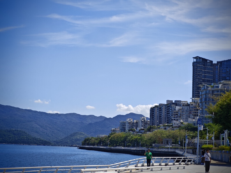 在繁华闹市里可眺见沙头角的大海,沿着海山路一路漫步,路的尽头可见一块巨石上印着“日出沙头月悬海角”八个大字,此处即著名的海景公园,顾名思义,在此能看到绝美海景。