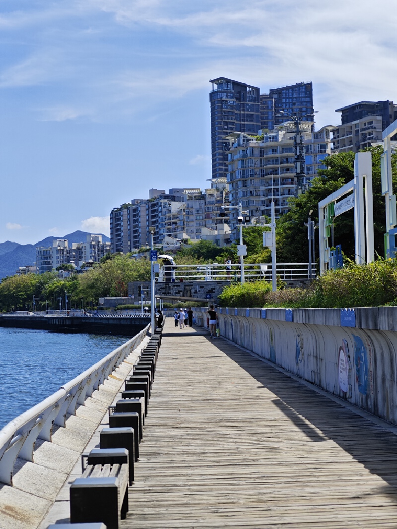 穿过广场,目光所及之处皆是蔚蓝大海,潮湿腥味的海风轻柔地将人包裹。午后夏日也聚满了人,卖冰糖葫芦的老爷爷,在直播的小姐姐和带着娃散步的妈妈……站在栈道上望去,可见码头上五颜六色的集装箱和绵延一片的山,蓝天与碧海相互映衬,天地在此刻是多么宽广。