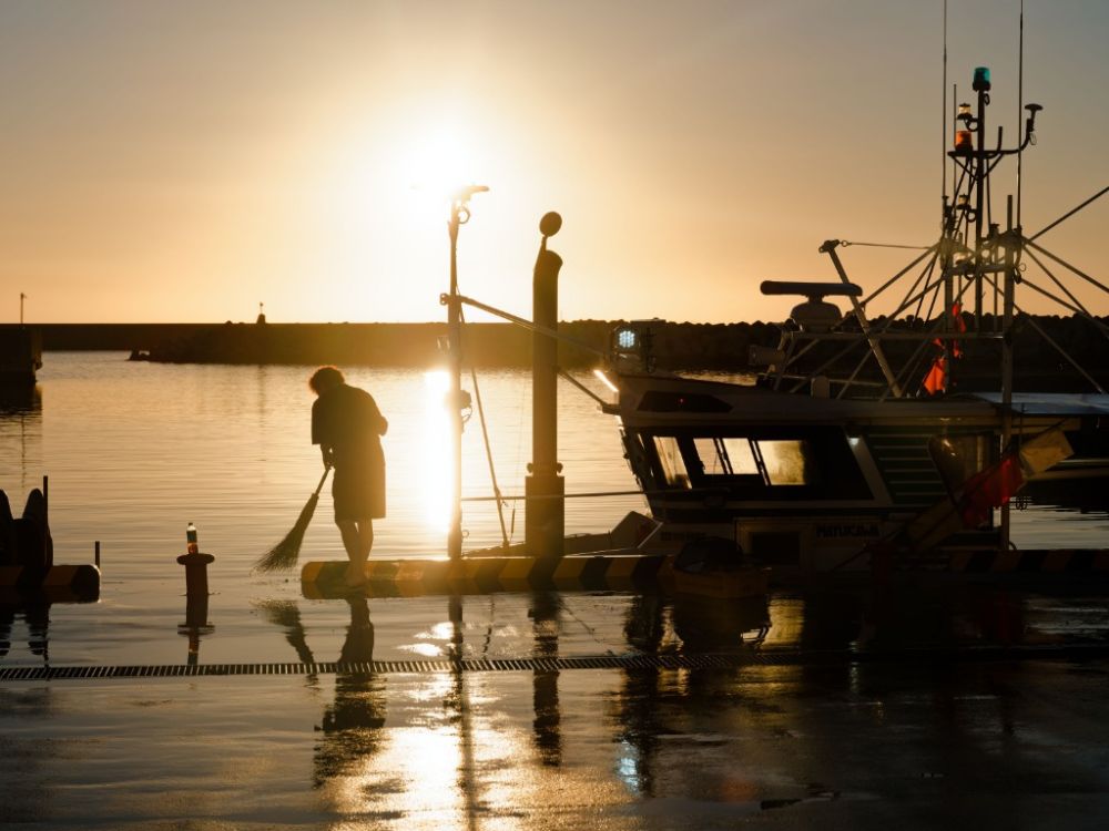 8月23日,捕鱼归来的渔民在日本福岛县新地町的渔港打扫。新华社记者 张笑宇 摄