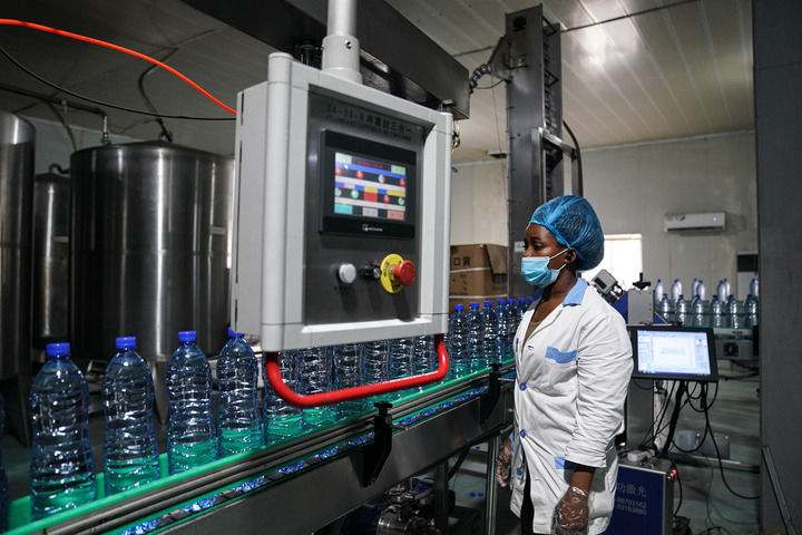 9月9日,当地员工在位于加蓬首都利伯维尔的欧来源纯净水厂生产线上工作。新华社记者 韩旭 摄