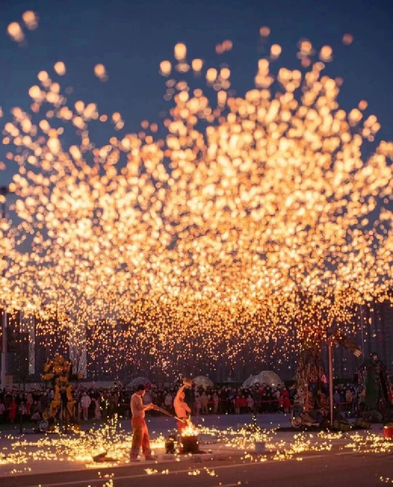 与烟花一样绚烂,非遗打铁花,邂逅千年浪漫,一勺1600°C铁水泼上天,迅速化为粉碎的微小颗粒,宛如满天繁星浪漫坠落。