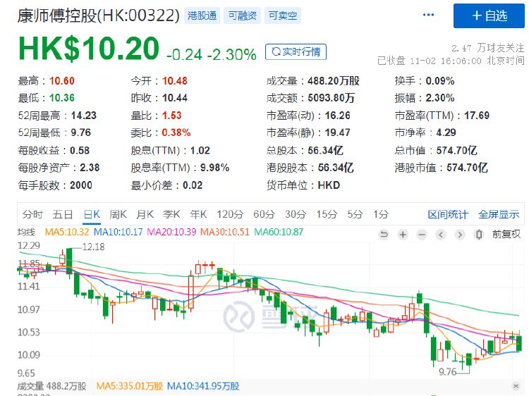 截至2日收盘,康师傅控股报10.20港元/股,下跌2.30%,总市值574.7亿港元。
