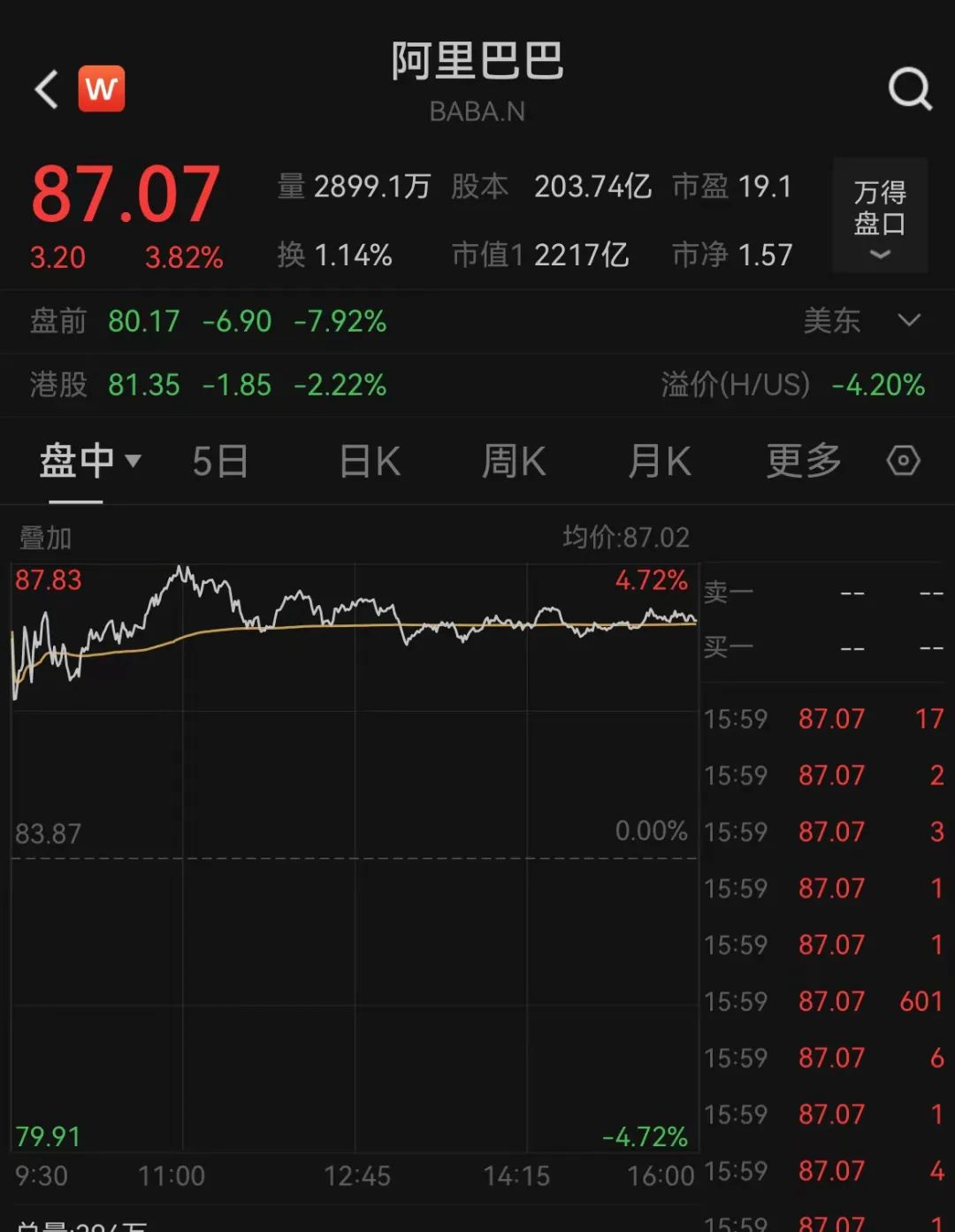 受到这一消息影响,阿里美股在北京时间11月16日盘前跳水,一度跌近8%。按美东时间11月15日阿里巴巴87.070美元/股计算,此次减持股票共涉及股票市值8.707亿美元。