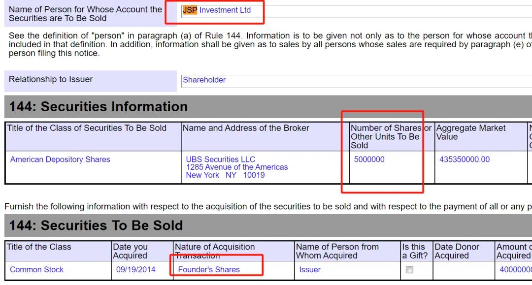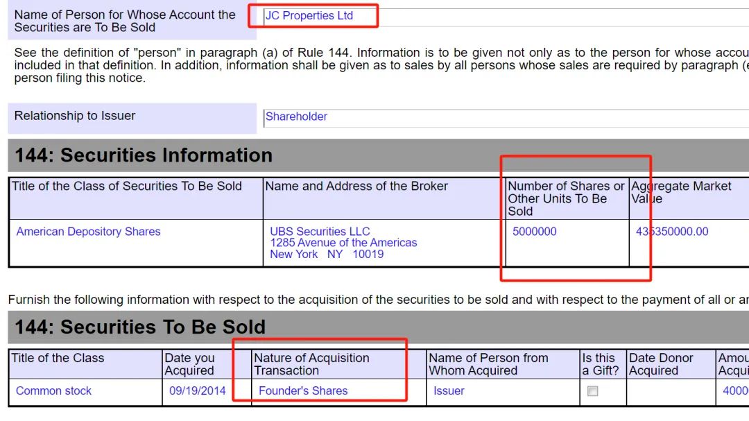 另据美国证交会(SEC)官网披露的F144文件显示,马云家族信托JC Properties Limited(一家英属维尔京群岛公司)和JSP Investment Limited(一家英属维尔京群岛公司)拟于11月21日分别减持500万股阿里巴巴创始人股份。