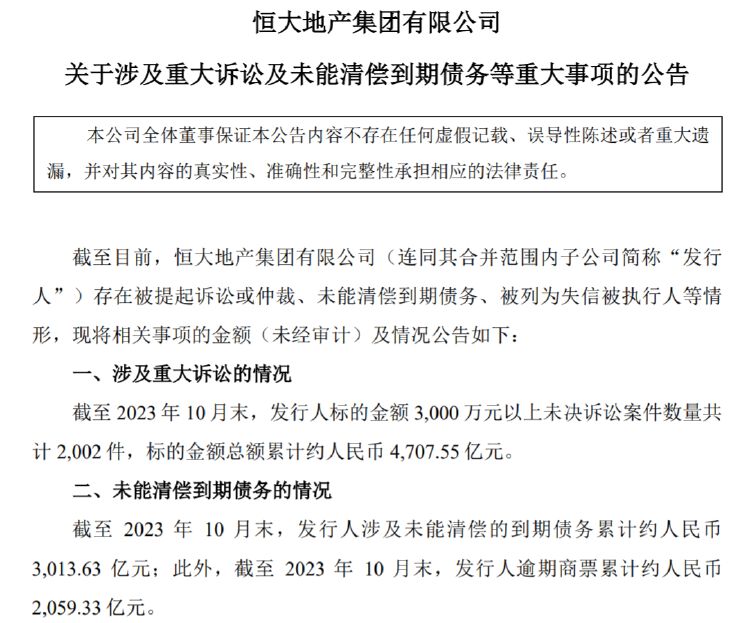 根据公告,恒大地产(连同其合并范围内子公司简称“发行人”)存在被提起诉讼或仲裁、未能清偿到期债务、被列为失信被执行人等情形,截至2023年10月末,发行人标的金额3000万元以上未决诉讼案件数量共计2002件,标的金额总额累计约4707.55亿元。截至2023年10月末,发行人涉及未能清偿的到期债务累计约3013.63亿元;此外,截至2023年10月末,发行人逾期商票累计约2059.33亿元。