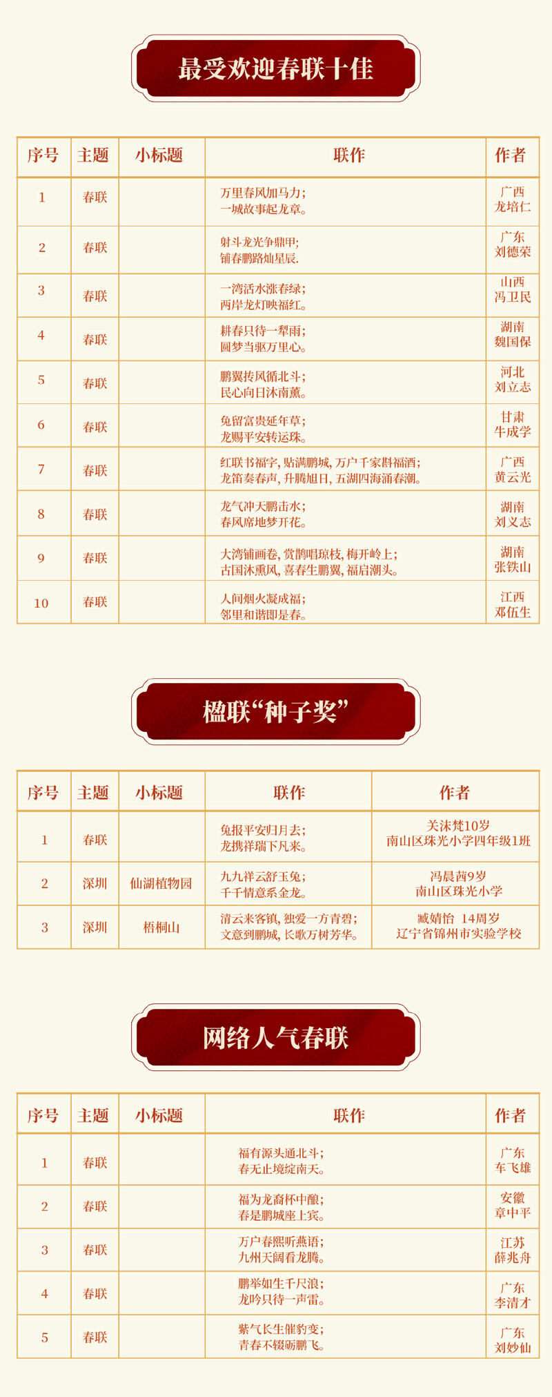 通过对作品内容、立意、技巧、意境进行多方面比较,最终中国楹联学会会长、深圳市楹联学会会长、中国楹联学会春联研究院智库专家团队等专业评审及主办方代表评选出118副获奖楹联。其中,“年度十大楹联”“深圳城市佳联”“最受欢迎春联”各10副,楹联“种子奖”(青少年组)3副,“网络人气春联”5副,“优秀奖”80副。