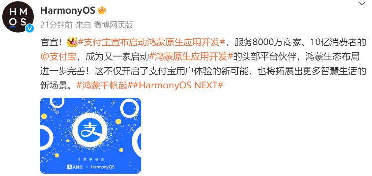12月8日,支付宝与华为终端宣布合作,基于HarmonyOS NEXT启动支付宝鸿蒙原生应用开发,成为又一家启动鸿蒙原生应用开发的头部平台伙伴。鸿蒙生态布局进一步完善!这不仅开启了支付宝用户体验的新可能,也将拓展出更多智慧生活的新场景。