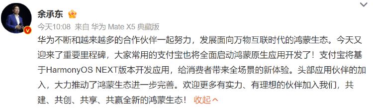 华为常务董事、终端BG CEO、智能汽车解决方案BU董事长余承东发文称:华为不断和越来越多的合作伙伴一起努力,发展面向万物互联时代的鸿蒙生态。今天又迎来了重要里程碑,大家常用的支付宝也将全面启动鸿蒙原生应用开发了!支付宝将基于HarmonyOS NEXT版本开发应用,给消费者带来全场景的新体验。头部应用伙伴的加入,大力推动了鸿蒙生态进一步完善。