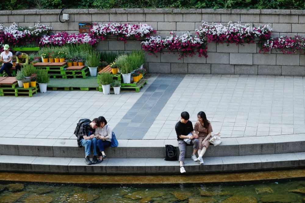 这是2019年6月2日,在韩国首尔,情侣在清溪川边休息。新华社记者 王婧嫱 摄
