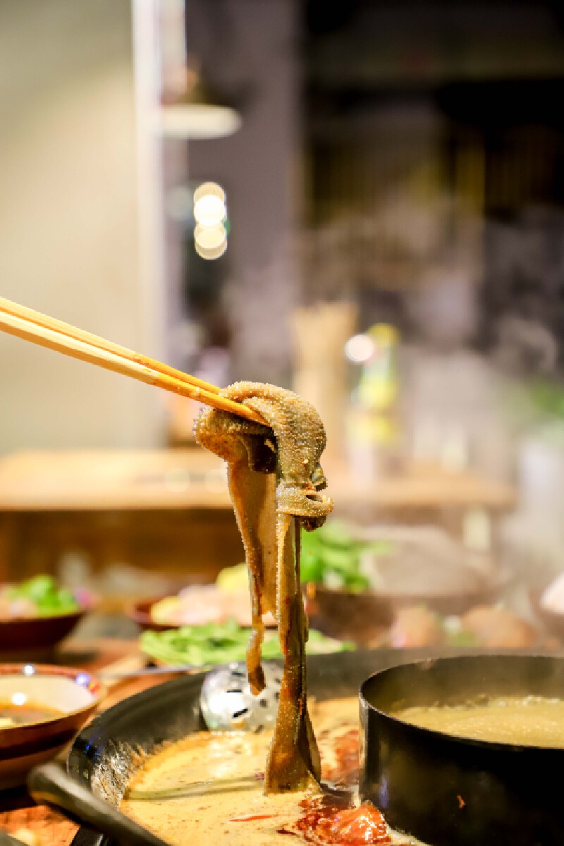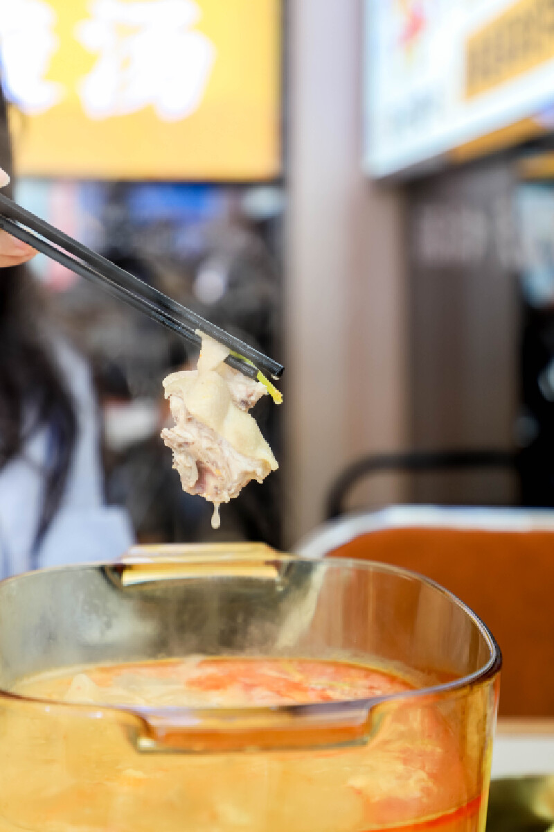 除此之外,文昌鸡也是糟粕醋的好搭档,酸辣浓郁的辣底糟粕醋锅底浸润在鸡肉的“每一寸肌肤”里,一口下去酸爽上头,根本控制不了自己的胃口!微醺的醋香可以说是将各种食材的鲜味提升到极致。