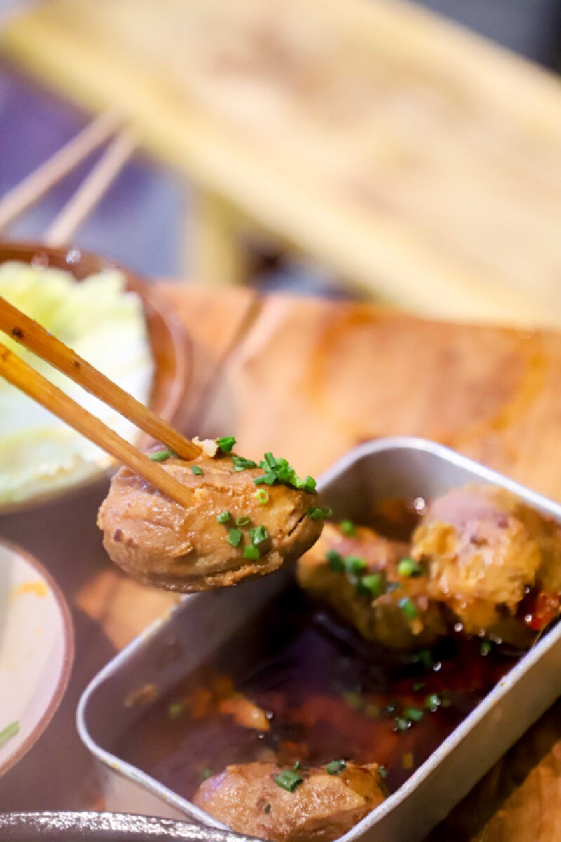把这些配菜放在香油大蒜调制的蘸料里一滚,放入口中,那一刻,犹如辛辣与火热在舌尖上起舞的华尔兹,激情与热烈在口腔中绽放。麻辣交织的滋味让人越吃越入迷,眼泪潺潺而下,没有盖碗里那口香派的茉莉花茶,无法解脱。
