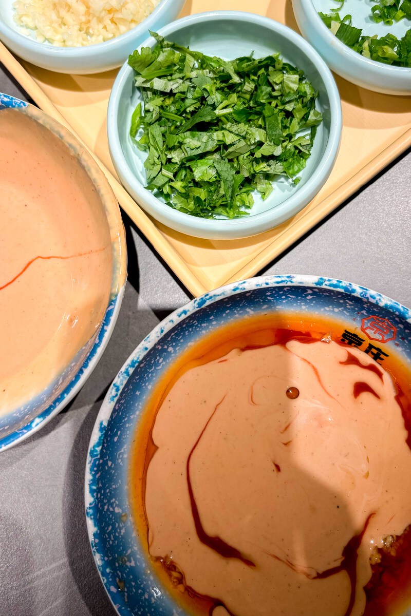 蘸料也非常讲究,传统的调料包括芝麻酱、腐乳等,每一种能够激发出羊肉的鲜甜口感,使其更加可口。老舍先生曾评价:好的涮羊肉,能吃出想象,吃出诗意,涮一片蘸进麻酱溜入口,就是动植物合起来的天地精华。