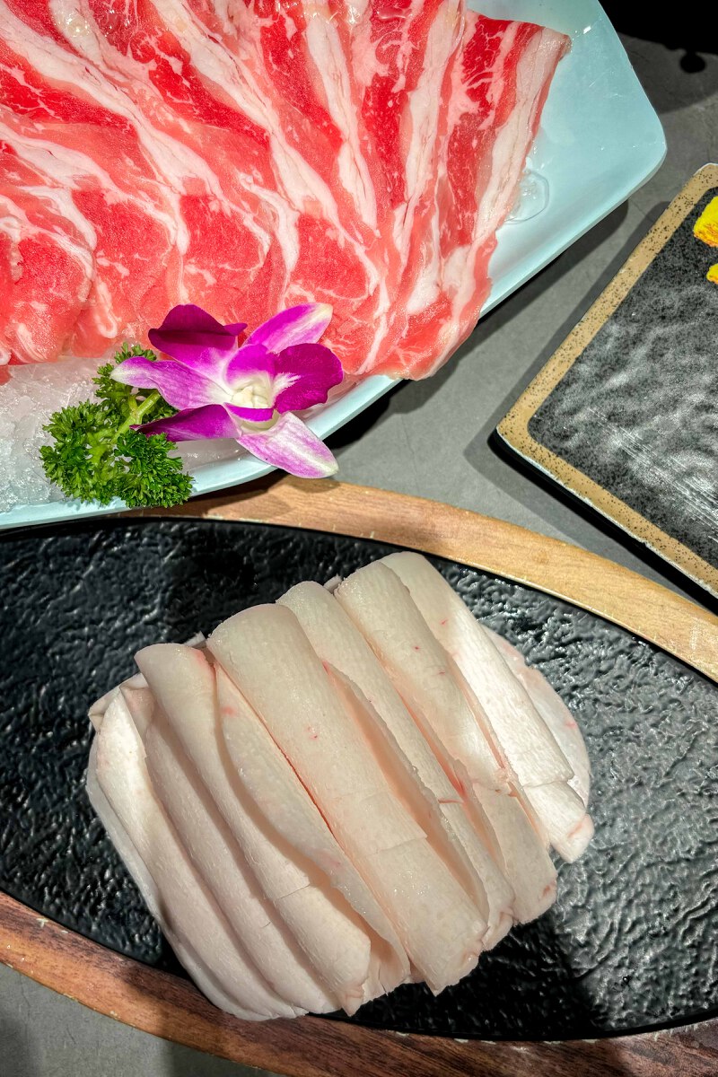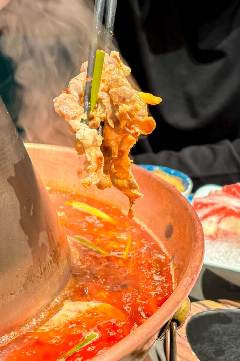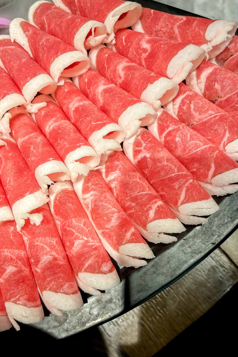 在汤底中,牛肉片只需轻轻一涮,便迅速吸收了汤汁的精华,肉质在热汤中迅速变得柔嫩,保留了牛肉最原始的甘甜。吊龙、匙柄、三花趾、雪花牛肉,不同部位的牛肉,在嘴里迸发不同的口感。整个脑门都萦绕着咀嚼牛肉的声音,细嫩无渣。
