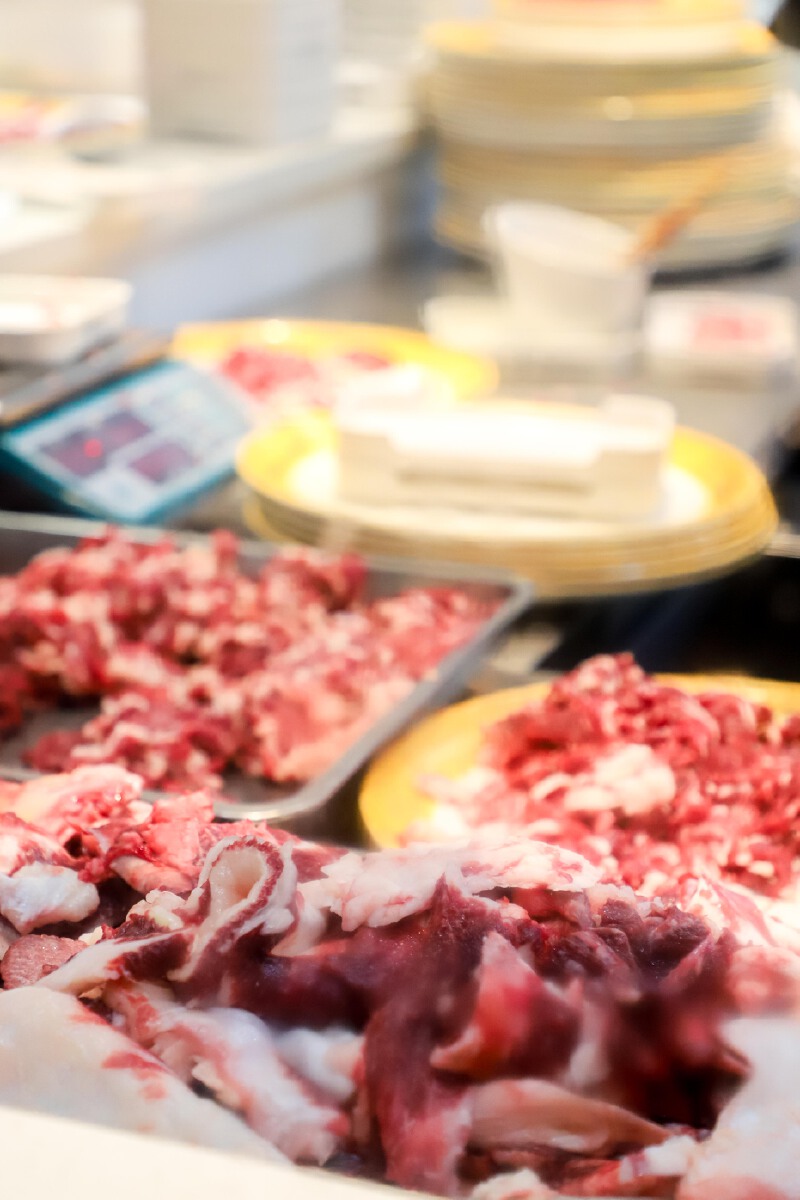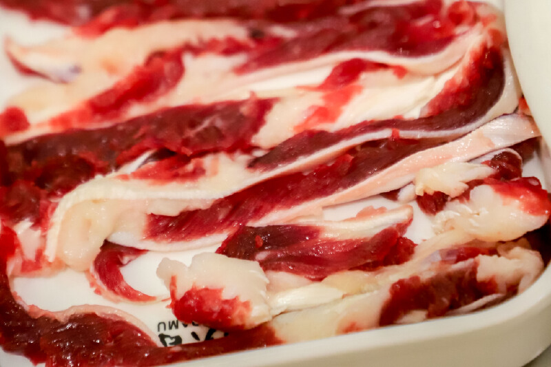 在这些师傅的巧手下,每一片牛肉都被切得轻薄如纸,呈现出诱人的红润色泽,肉质紧实而弹性十足,静静地铺在盘中,仿佛在等待被唤醒。