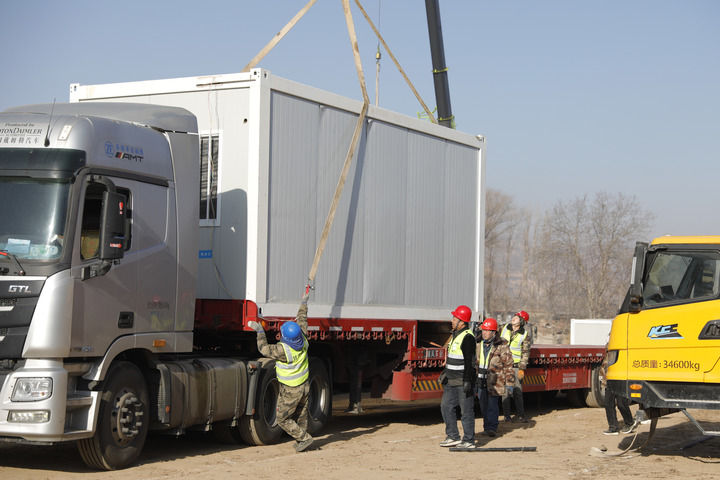 12月24日,在积石山县刘集乡陶家村一集中安置点,施工人员在搭建活动板房。新华社记者方欣 摄