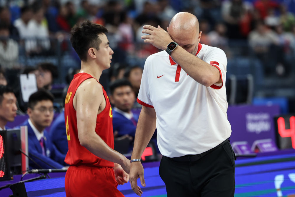 10月4日,中国队主教练乔尔杰维奇(右)在比赛后。当日,在杭州亚运会篮球项目男子半决赛中,中国队以76比77负于菲律宾队,无缘决赛。 新华社记者 潘昱龙 摄