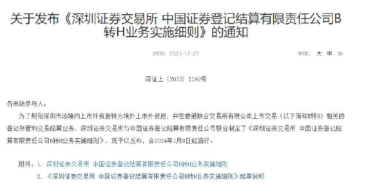 深交所网站12月29日消息,为了规范深圳市场境内上市外资股转为境外上市外资股,并在香港联合交易所有限公司上市交易(以下简称B转H)相关的登记存管和交易结算业务,深圳证券交易所与中国证券登记结算有限责任公司联合制定了《深圳证券交易所中国证券登记结算有限责任公司B转H业务实施细则》,现予以发布,自2024年1月8日起施行。