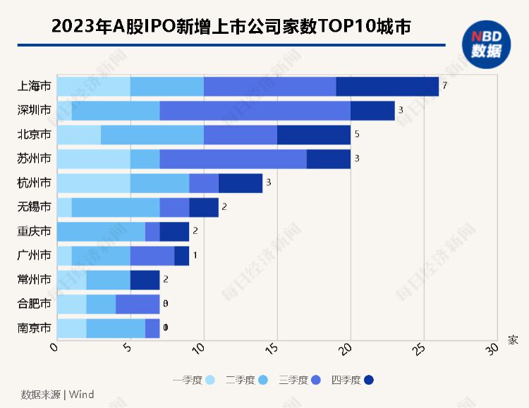Wind数据显示,2023年,国内通过A股IPO新增上市公司最多的四大城市分别是上海市、深圳市、北京市和苏州市,对应的新增数量分别为26家、23家、20家和20家。由于全年IPO企业上市数量下降,头部城市的IPO数也明显下降。