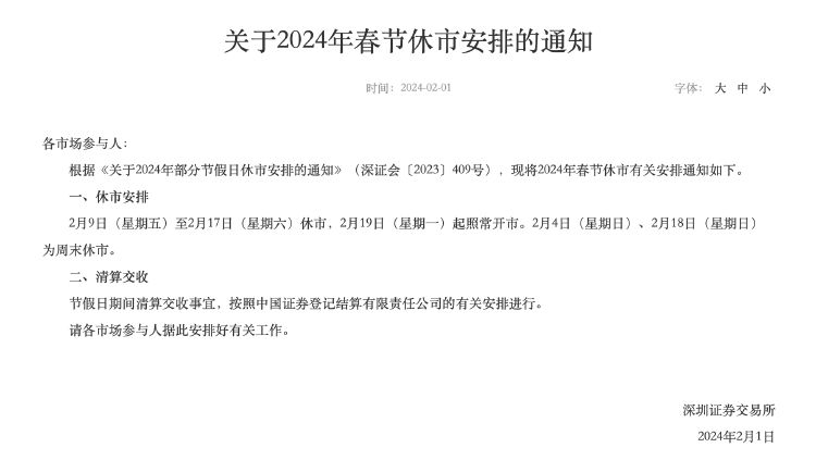 2月1日,沪深北交易所发布2024年春节休市安排公告,2月9日(除夕)至2月17日休市。
