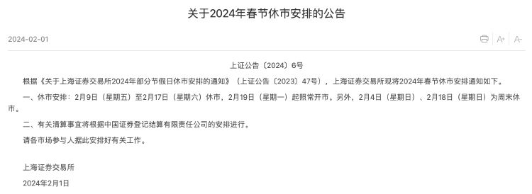 上交所公告,根据《关于上海证券交易所2024年部分节假日休市安排的通知》(上证公告〔2023〕47号),上海证券交易所现将2024年春节休市安排通知如下。