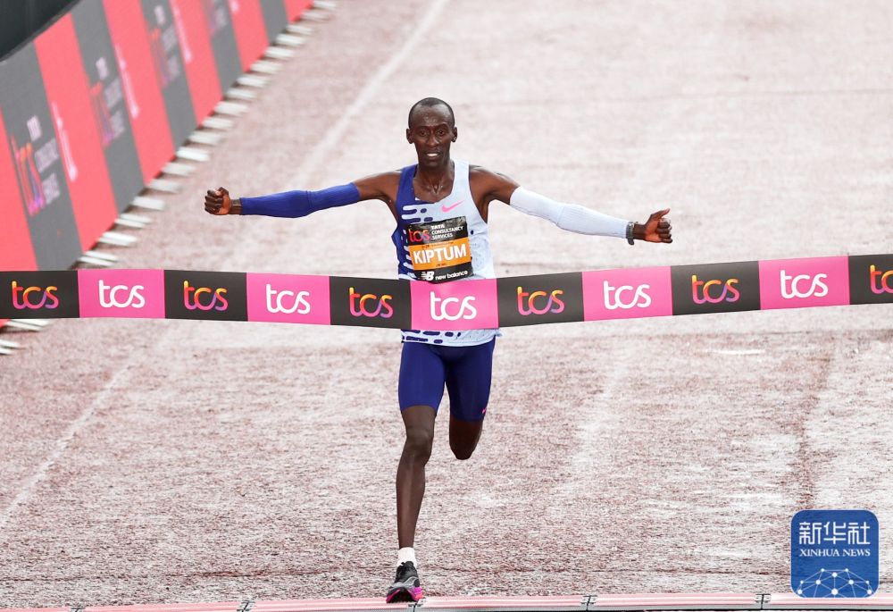 肯尼亚选手凯尔文·基普图姆在2023伦敦马拉松赛中冲过终点(2023年4月23日摄)。新华社记者 李颖 摄