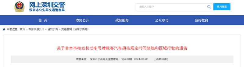2月1日,深圳交警正式发布《关于非本市核发机动车号牌载客汽车须按规定时间路线和区域行驶的通告》,继续对非本市核发机动车号牌载客汽车在全市工作日早晚高峰时段实施限行。