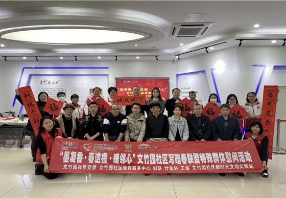 文竹园社区党委与党建共建单位南山市场监督管理局、蛇口育才教育集团育才二小、学生实践志愿服务队联动开展“墨凝香·春送福·暖邻心”文竹园社区写赠春联暨特殊群体慰问活动、“义心向善·追光同行”文竹园社区党群志愿者培育活动。服务联动了至少80名社区百团骨干参与组织策划,服务居民至少400人次。