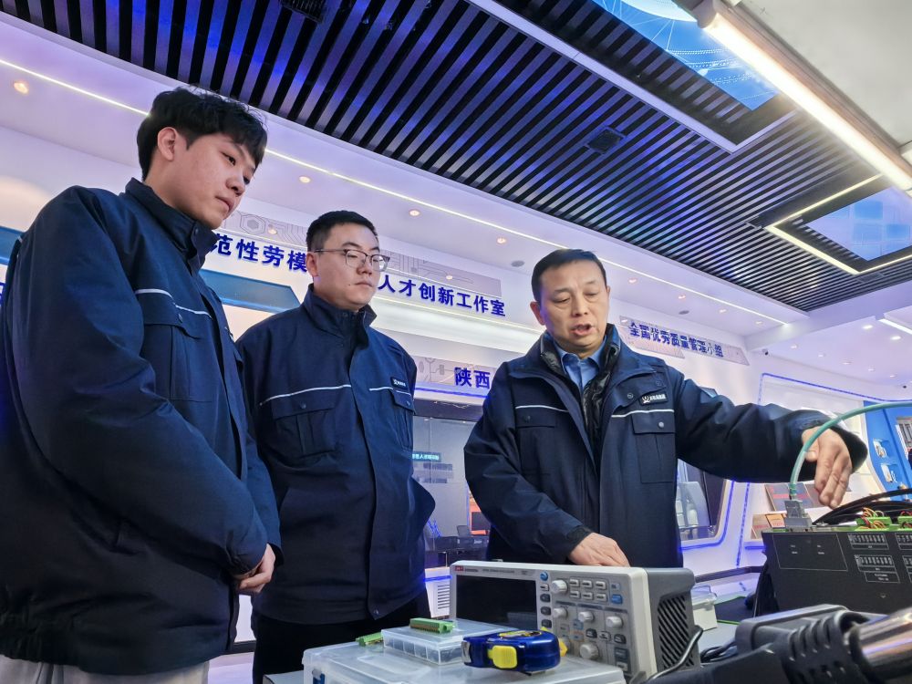 董宏涛(中间)正在给青年技工进行技术指导。新华社记者张斌 摄