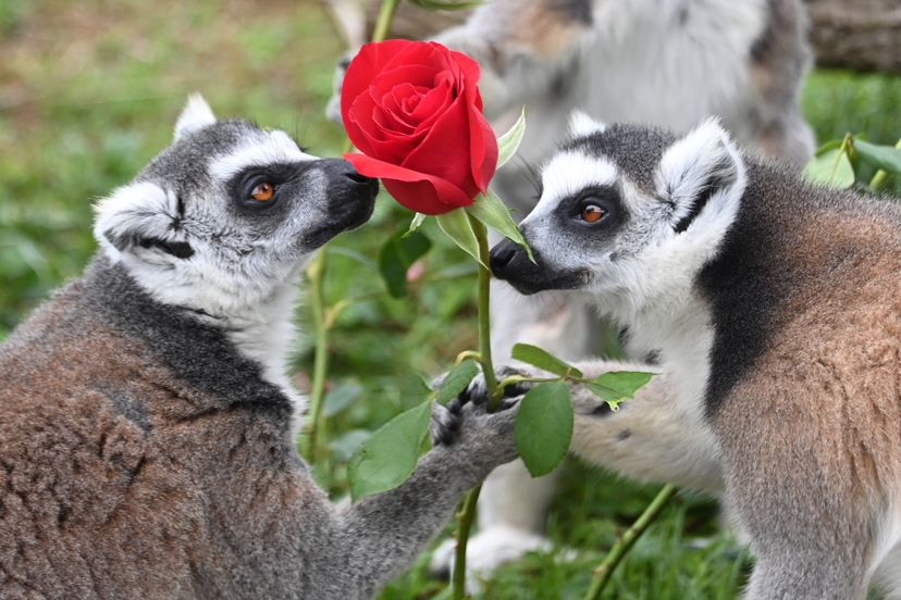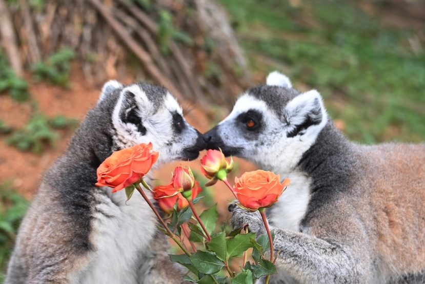 相比川金丝猴,环尾狐猴的毛色没有那么靓丽,但环尾狐猴有一条具有10多个黑白相间圆环的独特长尾。环尾狐猴喜欢鲜花程度不亚于川金丝猴,面对饲养员送来的鲜花,它们蜂拥而上,拿起鲜花爱不释手。场面一度出现两只猴同时握着鲜花面对面,或是来个“亲吻”,上演动物界“送花表达浓浓爱意”的温馨瞬间。