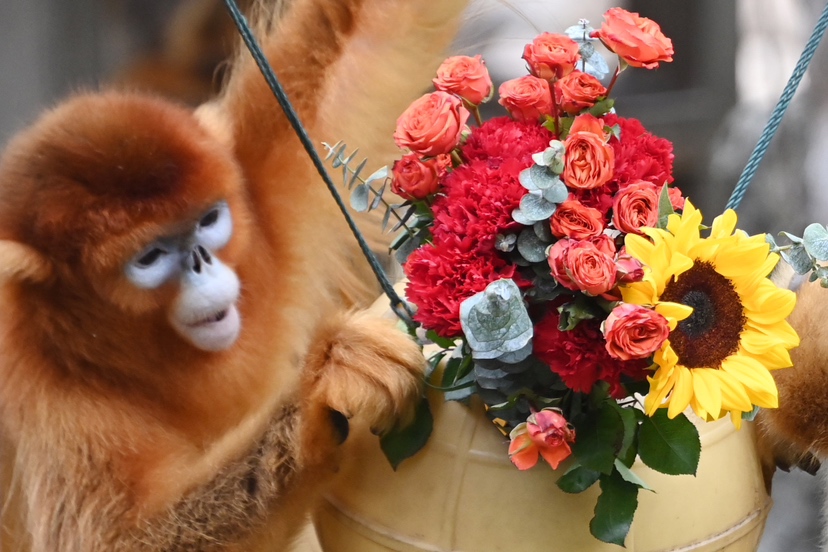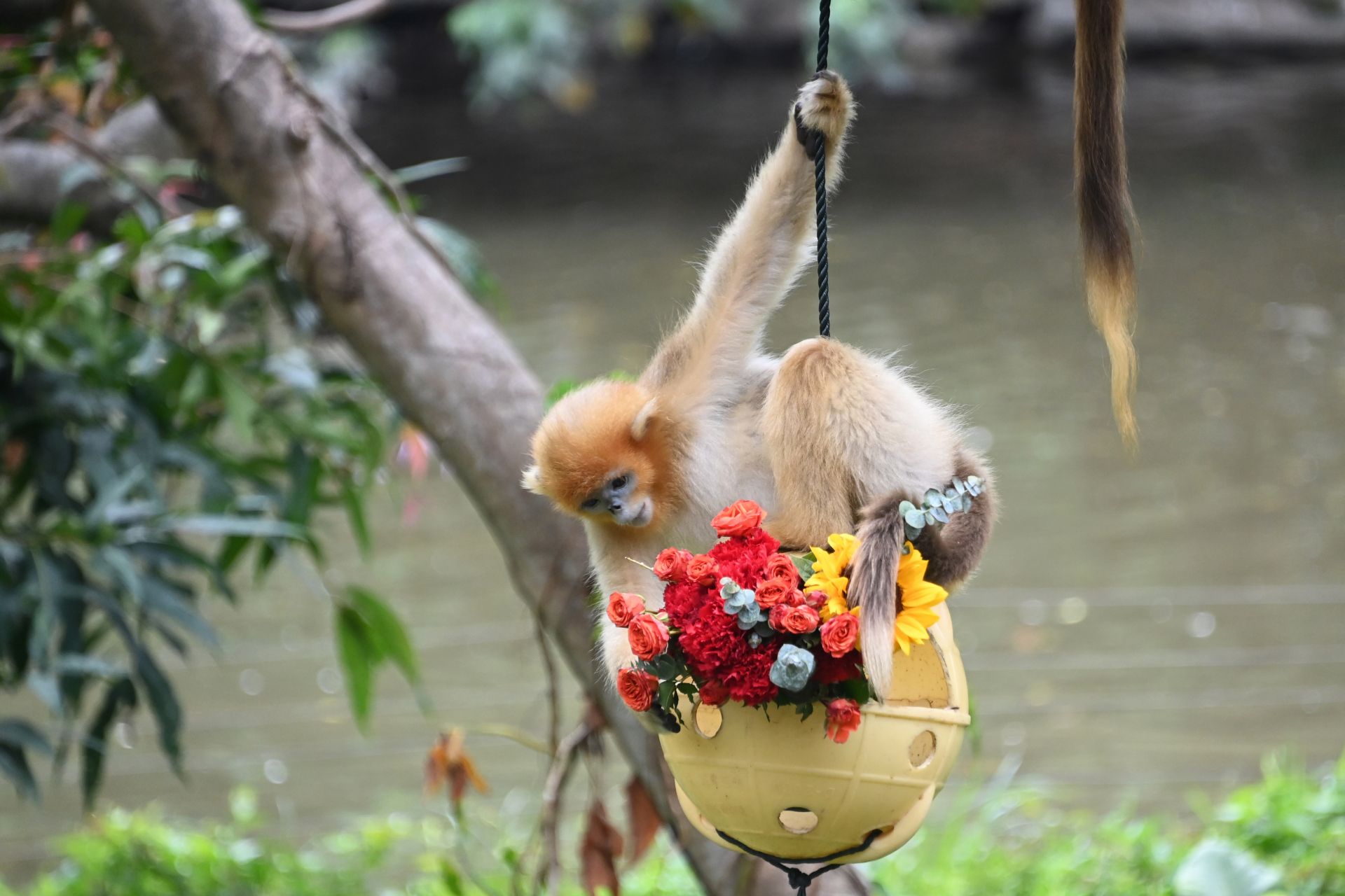 在金丝猴岛里,动物园饲养员把一束束鲜花挂在适合的高度上,或是插在树杈上。川金丝猴对鲜花充满好奇,纷纷上前接受鲜花好礼,细细欣赏,场面十分有趣。身披金毛的川金丝猴与花朵鲜艳色彩互相映衬,别有一番景象。